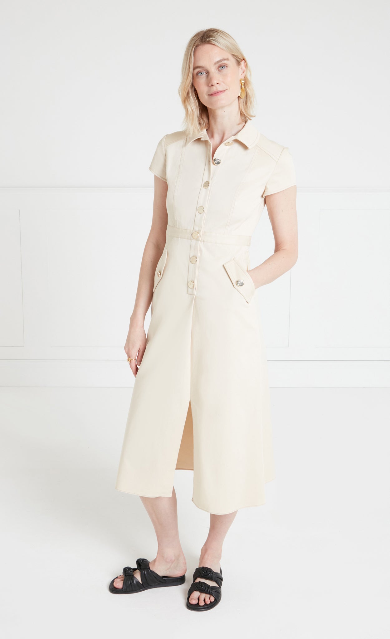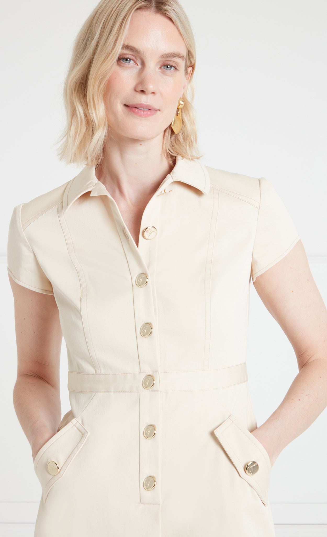 The Castell dress is an elevated workwear option inspired by classic military design. Fully topstitched for maximum durability, it features functional side pockets, short sleeves, a pointed collar, and gold-tone buttons for a refined finish, making it ideal for semi-casual occasions.