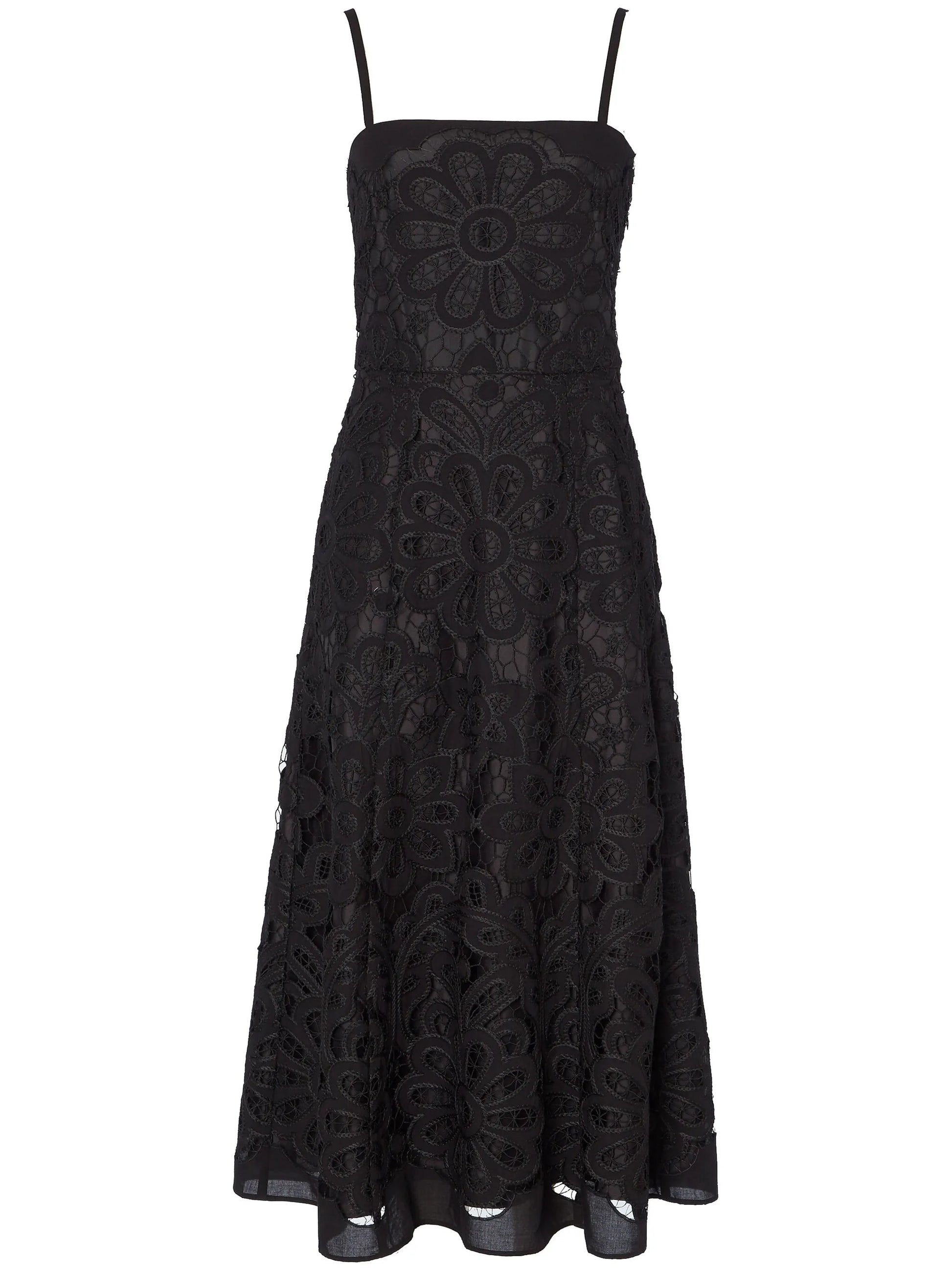 The Guinevere strappy dress is a light and feminine silhouette, showcasing intricate broderie anglaise. It is fully lined for comfort, with a waisted fit that accentuates the figure.